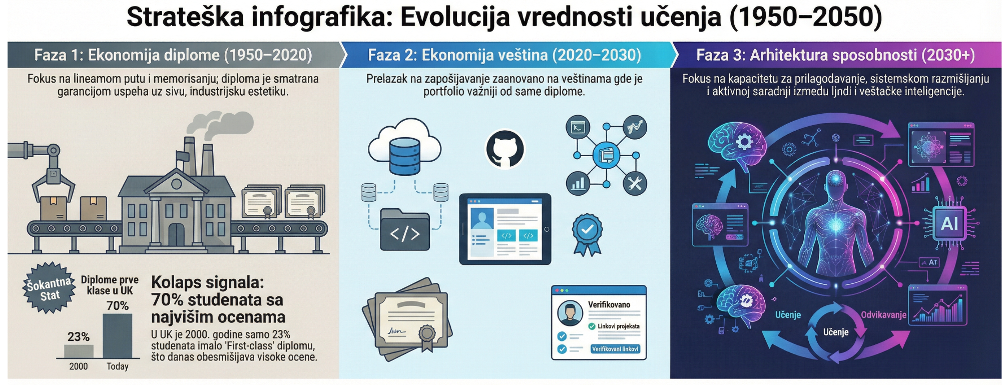 Diploma više nije cilj, već nusproizvod procesa učenja. U svetu koji se kreće brzinom svetlosti, vaša najveća vrednost nije ono što ste naučili na fakultetu, već vaša sposobnost da to znanje stalno nadograđujete, kritikujete i primenjujete u simbiozi sa najnaprednijim saznanjima i alatima našeg vremena.